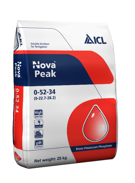 Рекомендуемая максимальная норма растворения для приготовления маточного раствора = 10-15 кг/100 литров воды. Преимущества Монокалийфосфат Nova Peak 0-52-34 Удобрение с наибольшей концентрацией фосфора.