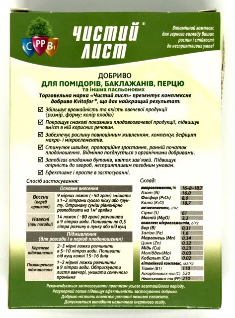 Удобрение кристаллическое "Чистый Лист" для томатов и перца 300 г. (Kvitofor) Макроэлементы (%): всего N - 16, P205 - 8, K2О - 18,7; Мезо элементы (г/кг): S - 61, MgO - 3,2; Микроэлементы (г/кг): Бор (В) - 0,31, Железо (Fe) - 1,6 Марганец (Мn) - 0,34, Цинк (Zn) - 0,32 Медь (Cu) - 0,23, Молибден (Мо) - 0,03, Кобальт - (Со) 0,02; Витаминный комплекс (мг/кг): Тиамин (В1) - 110, Аскорбиновая кислота (С) - 520, Никотиновая кислота (РР) - 210. Кристаллическое, комплексное, минеральное удобрение с микроэлементами и витаминами. Торговая марка «Чистый Лист» представляет идеальное удобрение, дающее лучший результат: - высокое качество плодов; - ранняя и высококачественная продукция благодаря сбалансированному составу N.P.K.; - отсутствие хлороза благодаря наличию железа и магния; - полная растворимость даже в холодной воде; - компенсирует дефицит макро- и микроэлементов; - эффективность и простота применения; - совместимо с пестицидами и другими удобрениями. Применение продукции ТМ «ЧИСТЫЙ ЛИСТ» - лучший способ поддержания плодородия почвы. Удобрение обеспечивает полноценное питание для растений и может быть использовано в любой системе полива (капельное орошение, дождевание, гидропоника и т.д.) Повышает урожайность и качество овощной продукции (размер, форму, цвет плодов).. Улучшает вкусовые качества плодовоовощной продукции, повышает содержание в них полезных веществ. Обеспечивает растение полноценным питанием, компенсирует дефицит макро и микроэлементов. Стимулирует быстрый, пропорциональный рост, раннее начало плодоношения. Отлично сочетается с органическими удобрениями. Предотвращает опадание бутонов, цветков завязей. Повышает сопротивляемость к болезням, не благоприятным погодным условиям. «ЧИСТЫЙ ЛИСТ» снимает стрессы от воздействия гербицидов и неблагоприятных погодных условий, повышает сопротивляемость растений болезням, что приводит к прибавке урожая в 1,5-2 раза.