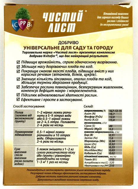 Удобрение кристаллическое "Чистый Лист" для сада и огорода универсальное 300 г. (Kvitofor) Макроэлементы (%): N -16,7 , P205 - 12, K2О - 15; Мезо элементы (г/кг): S - 49, MgO - 3,2; Микроэлементы (г/кг): Бор (В) - 0,31, Железо (Fe) - 1,6 Марганец (Мn) - 0,34, Цинк (Zn) - 0,32 Медь (Cu) - 0,23, Молибден (Мо) - 0,03, Кобальт - (Со) 0,02; Витаминный комплекс (мг/кг): Тиамин (В1) - 110, Аскорбиновая кислота (С) - 520, Никотиновая кислота (РР) - 210. Кристаллическое, комплексное, минеральное удобрение с микроэлементами и витаминами. Применение продукции ТМ «ЧИСТЫЙ ЛИСТ» - лучший способ поддержания плодородия почвы. Удобрение обеспечивает полноценное питание для растений и может быть использовано в любой системе полива (капельное орошение, дождевание, гидропоника и т.д.) «ЧИСТЫЙ ЛИСТ» снимает стрессы от воздействия гербицидов и неблагоприятных погодных условий, повышает сопротивляемость растений болезням, что приводит к прибавке урожая в 1,5-2 раза. Повышает урожайность, способствует одновременному вызреванию. Увеличивает массу созревающих плодов и ягод. Улучшает вкусовые качества плодов, повышает содержание в них полезных веществ( витаминов, белков, сахаров).Уменьшает количество порченных, опавших плодов и ягод, увеличивает сроки хранения продукции. Усиливает восстановительные способности растений. Торговая марка «Чистый Лист» представляет идеальное удобрение, дающее лучший результат: - высокое качество плодов и цветов; - ранняя и высококачественная продукция благодаря сбалансированному составу N.P.K.; - отсутствие хлороза благодаря наличию железа и магния; - полная растворимость даже в холодной воде; - компенсирует дефицит макро- и микроэлементов; - эффективность и простота применения; - совместимо с пестицидами и другими удобрениями. Рекомендуется применять в течение всего вегетационного периода. Регулярный полив повышает эффективность применения удобрения. Меры предосторожности: Рекомендуется выполнять работы в перчатках. При попадании на кожу промыть водой с мылом. Не допускать попадания в еду и внутрь организма. При попадании в глаза промыть большим количеством воды. При попадании внутрь организма выпить несколько стаканов воды, и вызвать рвоту. Обратиться к врачу. Рекомендации по хранению: Хранить в сухом, темном, не доступном для детей месте отдельно от лекарств и пищевых продуктов при t от -20 до +40°С. Срок годности: 36 месяцев.