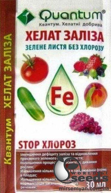 Квантум ХЕЛАТ ЖЕЛЕЗА - высококонцентрированное микроудобрение с хелатом железа. Применяется для профилактики и борьбы с хлорозом и для коррекции питания. Состав: Fe-3.2%, P2O5-3.2%, K2O-3.2%. Преимущества применения и результат: уменьшение дефицита железа и возобновление приятного зеленого цвета листьев; улучшение процесса фотосинтеза, дыхания растений; увеличение количества железа в усваиваемой форме в плодах; увеличение количества хлорофилла листьями растений; нормализация общего обмена веществ. Технология применения и дозы – опрыскивание: Профилактика хлороза: растворить содержимое пакета 120 мл в 40 л воды и опрыскивать этим раствором листья растений, не допуская стекания. Обработать 2-3 раза, начиная с появления первых листьев, с интервалом 2-3 недели. Лечение хлороза растений: растворить содержимое пакета 120 мл в 20 л воды для фруктовых деревьев или в 28 л воды для других культур. Опрыскивать этим раствором листья растений, не допуская стекания. Обработать 4 раза с интервалом 2 недели. Для ускорения эффекта через неделю после каждой обработки «Квантумом Хелат Железа» растения рекомендуется обработать микроудобрениями: «Квантум – Овощные», «Квантум – Декоративные», «Квантум – Плодово-Ягодные», в рекомендованных дозах.