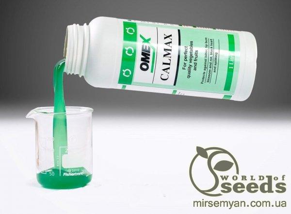 6. Омекс Кальмакс (N 15%, Ca 22,5%, Mg 30, Fe 0.75, Mn 1.5, Zn 0.3, Cu 0.6, B 0.75, Mo 0.015 грамм в 1 л) - сбалансированное удобрение по кальцию и магнию плюс азот и микро-элементы; в фазу роста и созревания плодов; эффективен при высоких температурах.