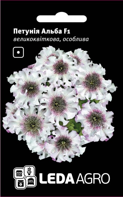 В первую очередь, эта группа сортов представляет крупноцветковую серию петуний, диаметром 16 см с волнистыми торчащими краями. В отличие от стандартных диплоидных сортов, альба триплоидная. Эта особенность отличает петунию от других, уникальной формой и цветом. Растения сильные высокие, слабо ветвятся, используют для ввысаживания в ящики и горшки, и в цветниках. Обильно цветет, большими белыми цветками, с темно-фиолетовыми прожилками, которые при температурах повыше, отливают фиолетовым цветом. Растения высокие, стойкие к неблагоприятным условиям. Саженцы требуют опрыскивания, пикировки в фазе 2-х настоящих листков. Петунию поливают с интервалом в 7-10 дней, начиная за неделю после высадки рассады. Поливают умеренно.