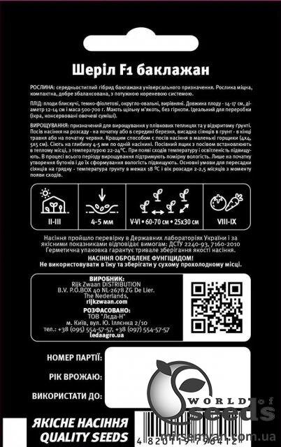 Упаковка МініТермін дозрівання СередньораннійКолір ЗеленийФорма плоду КруглийВиробник Rijk ZwaanБаклажан Шеріл F1 10 нас. Л