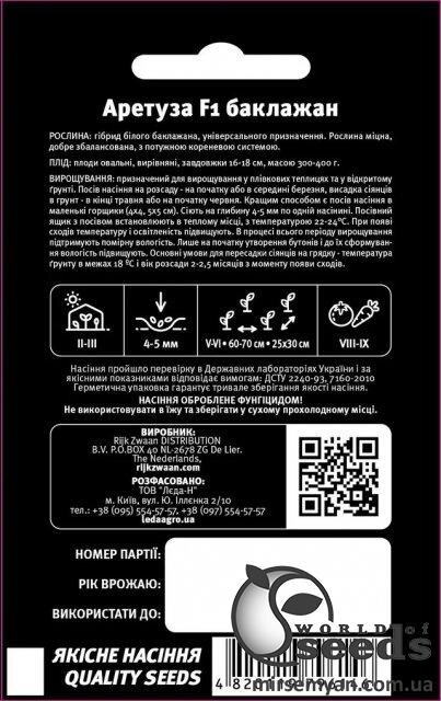 Упаковка МініТермін дозрівання СередньораннійКолір БілийФорма плоду ОвальнийВиробник Rijk ZwaanБаклажан Аретуза F1, 50 нас. Л
