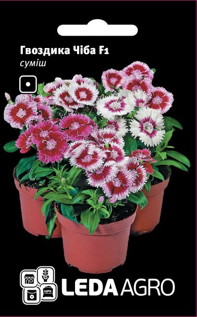 Dianthus interspecific Chiba F1 mix. Рання низькоросла серія. Висота в горщику 20-25 см, ширина 20-25 см. Характеризується компактною формою куща, гарним розгалуженням, стійкістю до несприятливих погодних умов. Квіти насичених кольорів. Цвітіння багате і тривале. Використовується для оформлення клумб, бордюрів, балконів. Легко вирощувати у горщиках та контейнерах.