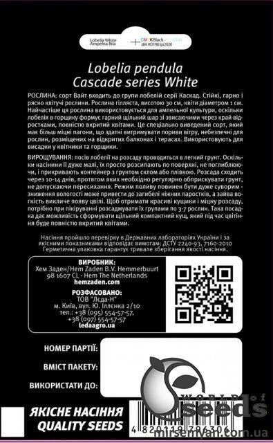 Сорт Уайт належить до групи лобелієвих серії Каскад. Стійкі, добре і рясно квітучі рослини. Рослина гілляста, висотою 30 см, квітки діаметром 1 см. Найчастіше ця рослина використовується для ампельної культури, оскільки лобелія в горщику формує хороший щільний шар з відростками, що звисають через край, повністю вкритий квітами. Це спеціально виведений сорт, який має міцніші пагони, здатні витримувати пориви вітру, небезпечні для рослин, розміщених на відкритих балконах та терасах. Використовують для висадки в квітники та горщики. Вирощування: зайняв лобелії на розсаду проводиться у легкий ґрунт. Оскільки насіння її дуже мале, його просто розсипають по поверхні, не поглиблюючи, і прикривають контейнер із ґрунтом склом або плівкою. Розсада сходить через 10-14 днів, протягом яких необхідно регулярно обприскувати ґрунт, не допускаючи пересихання. Режим поливу повинен бути дуже суворим – зниження вологості може призвести до загибелі ніжних паростків, а зайва вогкість викличе появу цвілі.