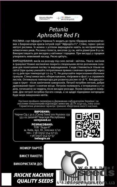 Рослина: сорт Афродіта Червона F1 входить до групи гібридних великобарвних з бахромчастим краєм петуній серії "Афродіта F1". Стійкі, добре і рясно квітучі рослини. Їх можна з успіхом вирощувати навіть за несприятливих кліматичних умов. Рослина гілляста, висотою 35 см, квітки діаметром 8-9 см. Використовують для висадки в квітники та горщики. При висаджуванні у горщики утворюють невеликий каскад. Рясно цвітуть. Вирощування: висів на розсаду під скло лютий – квітень. Увага: насіння у гранулах! Кожне насіння покрите спеціальним легко розчинним складом для полегшення посіву та вирощування. Сходи з'являються тільки на світлі (при цьому уникайте попадання прямих сонячних променів) через 10-15 днів при температурі 22-24°С. Не допускайте пересихання оболонки гранули. Сіянці вимагають обприскування, пікірування у фазі 2-х справжніх листків. Оптимальна температура для розвитку рослин 16-18°С Висадка розсади в ґрунт – після закінчення заморозків. Петунії потрібен легкий, добре дреновані.