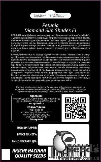 Рослина: сорт Даймонд належить до групи гібридних петуній типу "сурфінія". З успіхом використовується скрізь, де потрібен їхній каскадний характер: у кашпо, підвісних кошиках для оформлення "квітучих дерев". Довжина звисаючих пагонів досягає 80-100 см. Великою перевагою є стійкість рослин до шкідників та хвороб, хороший габітус рослини: каскад досягає довжини 100 см. Квітки інтенсивно фіолетового кольору, великого розміру 7,5-10 см. Висока схожість насіння. Вирощування: висів на розсаду під скло лютий – квітень. Увага: насіння у гранулах! Кожне насіння покрите спеціальним легко розчинним складом для полегшення посіву та вирощування. Сходи з'являються тільки на світлі (при цьому уникайте попадання прямих сонячних променів) через 10-15 днів при температурі 22-24°С. Не допускайте пересихання оболонки гранули. Сіянці вимагають обприскування, пікірування у фазі 2-х справжніх листків. Оптимальна температура для розвитку рослин 16-18°С Висаджує розсаду в грунт після закінчення заморозків.