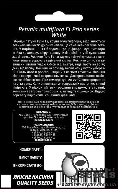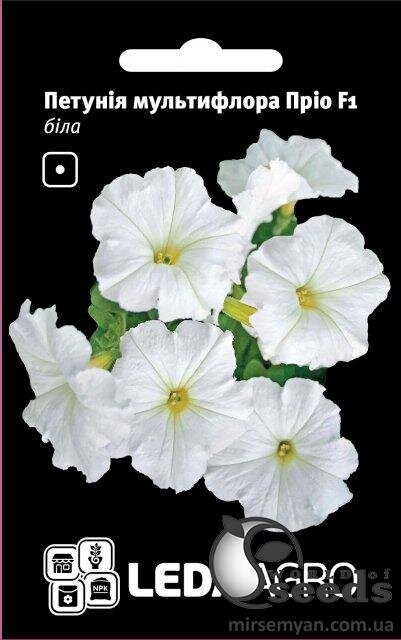 Гібриди петунії Пріо F1 групи мультифлора відрізняються великою кількістю дрібних квіток. Це порівняно з гібридами грандіфлора, мультифлора стійка до холоду, вітру і дощу. Квіти цієї петунії дуже рано зацвітають. Рослини Пріо F1 нагадують квітучі кульки, а в квітнику вони утворюють суцільний килим. Рослини 25-30 см заввишки, квітки гладкі 5-6 см в діаметрі, зацвітають на 70-75 день від посіву. Насіння на розсаду висівають у лютому-березні . Сіють його в розсадні ящики з легким ґрунтом. Насіння сіє поверхнево і накриває склом. Для проростання насіння потрібне світло. За температури 20-22°С воно проростає на 7-12 день. Коли з'являться 2-3 справжні листочки, сіянці пікірують. У відкритий ґрунт рослини висаджують у травні,