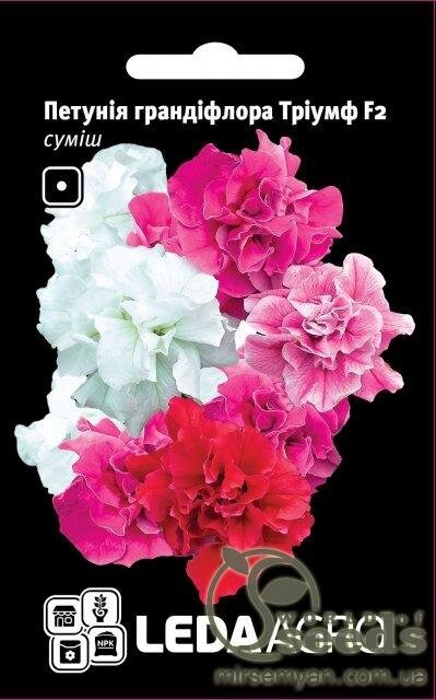 Петунія Тріумф – однорічна рослина. Кущі розлогі висотою до 50 см, повністю всипані великими, лійчастими, махровими і напівмахровими квітами, діаметром 6-12 см. Квітки білі, рожеві, темно-червоні, фіолетові. Насіння на розсаду висівають у лютому-березні. Сіють його в розсадні ящики з легким ґрунтом. Насіння сіє поверхнево і накриває склом. Для проростання насіння потрібне світло. За температури 20-22°С воно проростає на 7-12 день. Коли з'являться 2-3 справжні листочки, сіянці пікірують. У відкритий ґрунт рослини висаджують у травні, коли мине загроза заморозків на відстані 20-40 см. Цвітіння рясно і тривале, з червня до заморозків. Віддає перевагу відкритим, сонячним ділянкам. Потребує підживлення. Рослина витримує короткочасну посуху. Висаджують на клумби, рабатки, в садові вази, кашпо, балконні ящики. Ідеальна для створення квіткових бордюрів. Hem Zaden BV є приватною компанією, заснованою в 1918 році в Хем, невеликому селі, розташованому неподалік Енхуйзена у Вест-Фрісландії (Нідерланди), де знаходиться голландська насіннєва промисловість. Спеціалізується на виробництві та оптовому продажу насіння квіток та насіння трав усіх видів. Понад 3000 видів однорічних, дворічних та багаторічних сортів квітів. Це робить Hem Zaden найбільшим у світі виробником насіння квітів. Протягом виробничого періоду культура контролюється на регулярній основі добре навченим персоналом для забезпечення високої якості насіння. де знаходиться голландська насіннєва промисловість. Спеціалізується на виробництві та оптовому продажу насіння квіток та насіння трав усіх видів. Понад 3000 видів однорічних, дворічних та багаторічних сортів квітів. Це робить Hem Zaden найбільшим у світі виробником насіння квітів. Протягом виробничого періоду культура контролюється на регулярній основі добре навченим персоналом для забезпечення високої якості насіння. де знаходиться голландська насіннєва промисловість. Спеціалізується на виробництві та оптовому продажу насіння квіток та насіння трав усіх видів. Понад 3000 видів однорічних, дворічних та багаторічних сортів квітів. Це робить Hem Zaden найбільшим у світі виробником насіння квітів. Протягом виробничого періоду культура контролюється на регулярній основі добре навченим персоналом для забезпечення високої якості насіння.