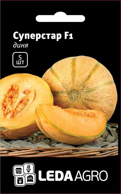 Суперстар F1 5. Ранній гібрид дині типу «Італійська сітчаста». Плоди овально-округлої форми, сегментовані, масою 1,6-2,3 кг. М'якуш відмінної якості, помаранчевого привабливого кольору, зі стійким ароматом і високим вмістом цукру. Гібрид забезпечує високу врожайність у відкритому та закритому ґрунті. Часто використовують у харчовій промисловості (для виробництва йогуртів, салатів). Відмінно транспортується при своєчасному та регулярному зборі врожаю.