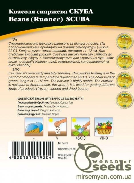 Упаковка МініТермін дозрівання РаннійКолір ЗеленийТип СпаржеваВиробник World of SeedsКвасоля Скуба 20г. WoS