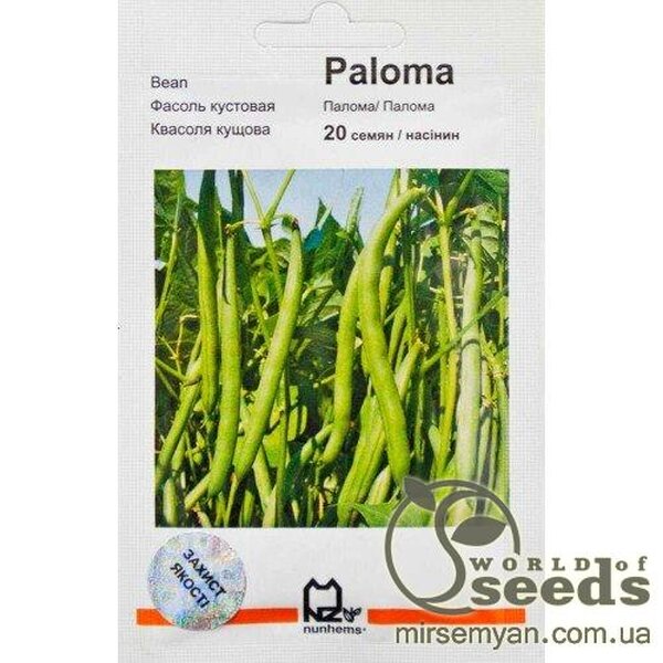 Квасоля кущова "Палома" - це спаржева квасоля для дуже ранніх та пізніх термінів посіву. Пік плодоношення повинен посідати помірні температури, нижче 32С. Колір стручка темно-зелений, довжина – 11-12 см. Дає стабільно високий урожай. Сорт має високу польову стійкість до антракнозу, вірусу 1, Pseudomonas. Використовується для отримання будь-яких видів продукції (різання, цілої, свіжозамороженої, консервованої та сухої квасолі). Дуже ранні терміни сівби, висока продуктивність, універсальне використання.