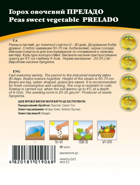 Упаковка МініТермін дозрівання РаннійВиробник World of SeedsГорох овочевий Преладо 20 г. WoS (Syngenta)