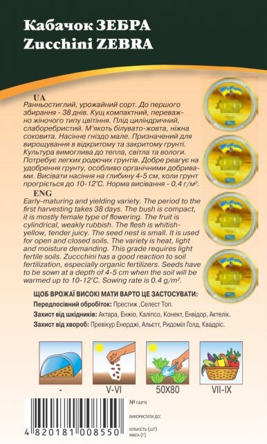World of Seeds ukraine Упаковка МініТермін дозрівання РаннійКолір ЗеленийВиробник World of SeedsКабачок Зебра 3 г. WoS