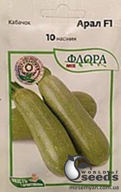 Арал F1, надранній гібрид кущового кабачка. Початок першого збирання плодів через 30 днів. Плоди циліндричної форми, світло-зеленого кольору, м'якуш білий. Рослина компактна кущового типу, напіввідкрита, що полегшує збирання плодів. Відрізняється високою зав'язаністю плодів, високим відсотком товарних плодів однорідної якості. Високоврожайний гібрид з довгим періодом плодоношення навіть за низьких температур.