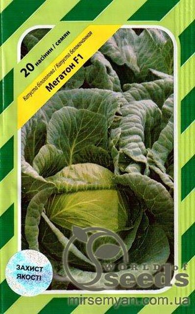 Насіння капусти білокачанної Мегатон F1, фасовка 20 насінин. Найврожайніший середній гібрид капусти для свіжого споживання і квашення. Період дозрівання від висадки розсади становить 102 дні. Формує круглі качани із середньою вагою 8 кг (зустрічаються екземпляри та 10 кг). Качан тугий, має чудовий товарний вигляд та смакові якості. Капуста потребує високих норм добрив. Має досить обмежений час зберігання, тому рекомендується отримання високоякісної продукції в осінній період. Площа живлення 60x60 см. стійкий до фузаріозу. При купівлі насіння на суму 200 гривень, доставка проводиться за рахунок нашої компанії!