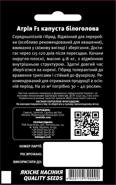 Упаковка МініТермін дозрівання СередньопізнійВиробник SeminisНасіння капусти Атрія F1 20 семена L (Seminis)