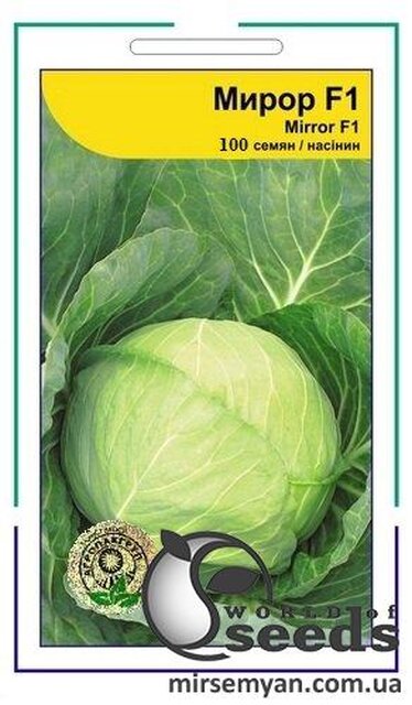 Насіння капусти білокачанної Мірор F1. Надранній гібрид білокачанної капусти. Термін дозрівання – 45-50 днів. Качани привабливі, яскраво забарвлені, гладкі, блискучі, середньою вагою – 1,5 кг. Гібрид відрізняється високою силою зростання. Висока ніжка дозволяє уникнути підпревання качана в полі та забезпечує легкість прибирання. Компактна листова розетка дозволяє робити загущену посадку. Рекомендується для вирощування під плівкою, укривним матеріалом та у відкритому грунті. Стійкий до фузаріозу
