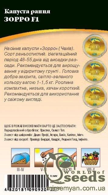 Насіння капусти "Зорро" (Чехія). Сорт ранньостиглий, вегетаційний період 48-55 днів. Від висаджування розсади. Рекомендується для вирощування у відкритому ґрунті. Качан добре закритий, світло-зеленого кольору масою 1-1,5 кг. Рослина компактна, низька, качан короткий. Рекомендується для використання у свіжому вигляді.