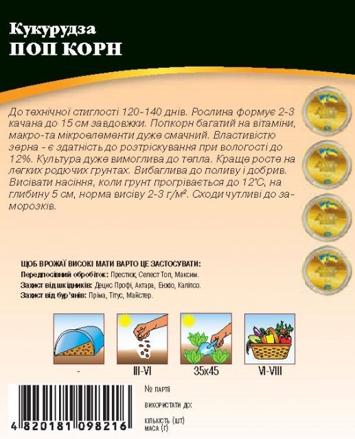 Кукурудза Попкорн До технічної стиглості 120-140 днів. Рослина формує 2-3 вилки до 15 см завдовжки. Попкорн багатий на вітаміни, макро та мікро елементи, дуже смачний. Властивістю зерна є здатність до розтріскування при вологості до 12%. Культура дуже вибаглива до тепла. Краще росте на родючих ґрунтах. Вибаглива до поливу та добрив. Висівати насіння, коли ґрунт прогрівається до 12°С, норма висіву 2-3 г/м2. Сходи чутливі до заморозків.