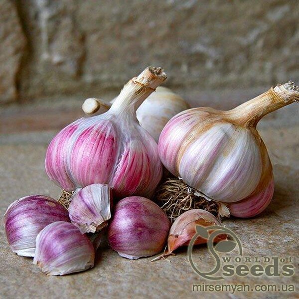 Чудовий сорт з фіолетовою шкіркою з великими білими зубцями та м’яким смаком, який легко зберігати та розділяти для приготування. (в середньому 6-9 великих зубчиків на цибулину)