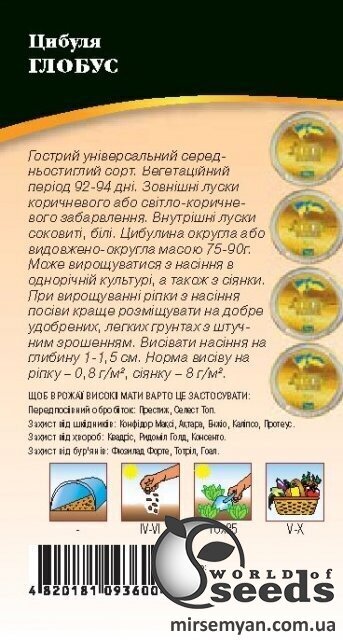 Цибуля Глобус - середньопізній сорт цибулі. Вирощується з насіння в однорічній культурі. Вегетаційний період від посіву до збирання врожаю – 92-94 дні. Цибулина овальної форми, зовнішні лусочки коричневі або світло-коричневі, внутрішні - білі зі світло-салатним відтінком, соковиті. Вага цибулини – 75-90 г. Смак гострий. Характеризується одночасним дозріванням. Придатний для тривалого зберігання. Універсального використання