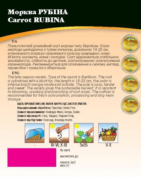 Морква Рубіна Пізньостиглий урожайний сорт моркви типу Берлікум. Коренеплоди циліндричні з тупим кінчиком, довжиною 18-22 см, інтенсивного яскраво-жовтогарячого кольору всередині та зовні. М'якуш соковитий, ніжний і солодкий. Сорт відрізняється стабільною врожайністю, стійкістю до цвітіння, розтріскування та розгалуження коренеплодів. Рекомендується для споживання у свіжому вигляді, переробки та тривалого зберігання.