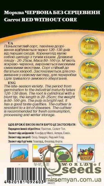 Морква Червона без серцевини Пізньостиглий сорт, технічне дозрівання відбувається через 120-130 днів від перших сходів. Коренеплід є циліндром з тупим кінцем. Довжина плода – 20-25 см., маса 80-100 гр. М'якуш яскраво-червоний, відрізняється високими смаковими якостями. Сорт стійкий до багатьох хвороб. Застосовується для споживання у свіжому вигляді, для переробки та для тривалого зимового зберігання.