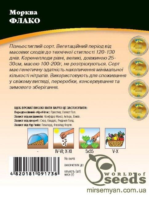 Насіння моркви Флако - середньостиглий сорт 120-130 днів. Коренеплоди оранжевого кольору, веретеноподібні, довжиною до 30 см, масою 100 - 200 г. Сорт має відмінні смакові якості, високий вміст каротину. Використовують у свіжому вигляді, для зберігання та переробки.