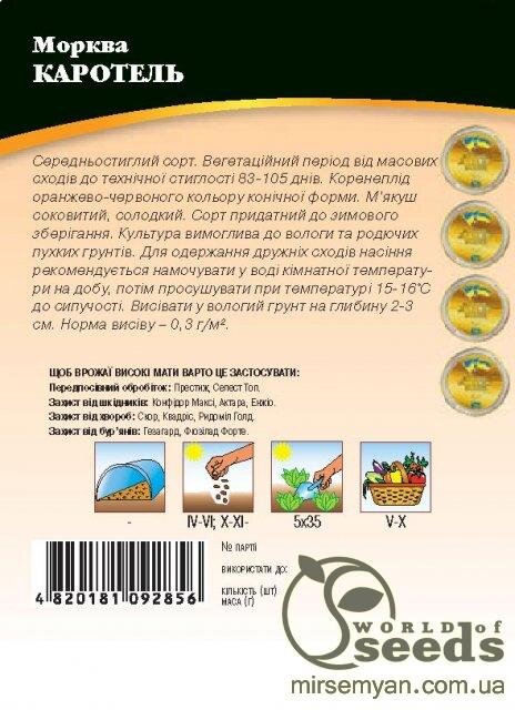 World of Seeds ukraine Упаковка ВаговіТермін дозрівання Середньоранній СереднійКолір ЧервонийВиробник World of SeedsМорква "Каротель" 1 кг. WoS