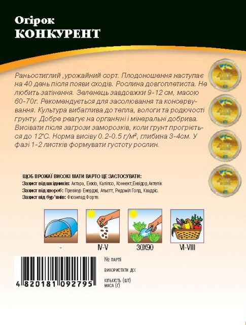 Бджолозапильний. Рослина довгоплетиста. Врожайність – 3,3-3,8 кг/кв.м. Особливості агротехніки: для відкритого ґрунту та тимчасових плівкових укриттів. Терміни дозрівання: ранньостиглий, починає плодоносити на 45-50 день після появи сходів. Плоди великогорбчасті, чорношипі, довжиною 10-14 см, плодоніжка 5-7 см, маса плодів до 130 г. Стійкий до несправжньої борошнистої роси та бактеріозу. Використання: для консервування та засолювання. Особлива цінність сорту Конкурент полягає у його стійкості до борошнистої роси, завдяки чому підвищується гарантованість збору максимального врожаю. Завдяки довгій плодоніжці зеленці зручно збирати. Сорт Конкурент відрізняється чудовим смаком як свіжих, так і консервованих плодів.