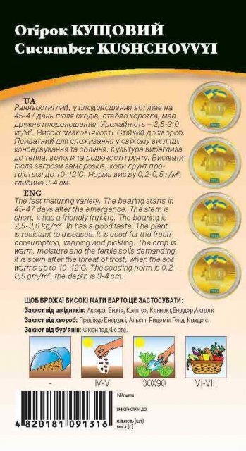Огірок Кущовий Ранньостиглий, в плодоношення вступає на 45-47 день після сходів, стебло коротке, має дружнє плодоношення. Урожайність – 2,5-3,0 кг/м2. Високі смакові якості. Стійкий до хвороб. Придатний для споживання у свіжому вигляді, консервування та соління. Культура вимоглива до тепла, вологи та родючості ґрунту. Висівати після загрози заморозків, коли ґрунт прогріється до 10-12°С. Норма висіву 0,2-0,5 г/м2, глибина 3-4 см.