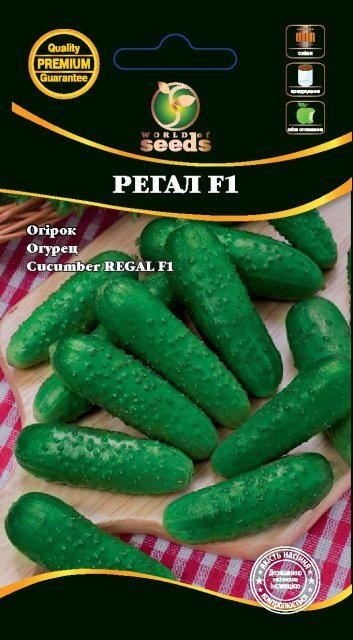 Огірки Регал F1 Дуже ранній (45-48 днів) бджолозапильний гібрид огірка. Плоди приємного зеленого кольору, з дрібними шипами, вирівняні за товщиною та довжиною. Призначений для соління, консервування, споживання у свіжому вигляді. Чудова транспортабельність. Подовжений період плодоношення, висока врожайність та стійкість до хвороб – основні переваги цього гібриду. При вирощуванні в літніх теплицях дає мінімум 1000 кг із сотки.
