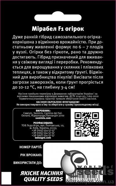 Упаковка МініТермін дозрівання РаннійВиробник Bejo ZadenОгірок Мірабел F1 10 семена Л