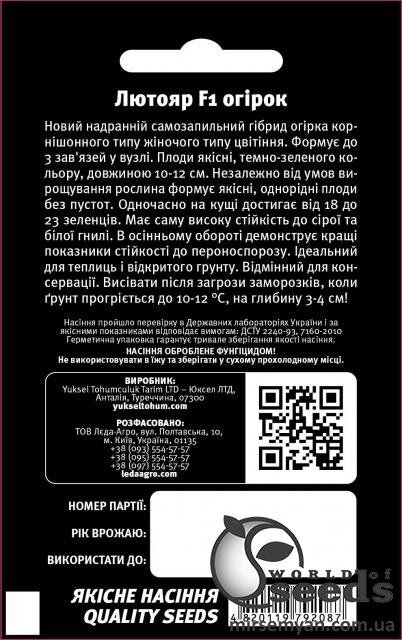 Лютояр F1, Новий надранній самозапильні гібрид огірка корнішонного типу жіночого типу цвітіння. Формує до 3 зав'язей у вузлі. Плоди якісні, темно-зеленого кольору, довжиною 10-12 см. Незалежно від умов вирощування рослина формує якісні, однорідні плоди без порожнеч. Одночасно на кущі дозріває від 18 до 23 зеленців. Має найвищу стійкість до сірої та білої гнилі. В осінньому обороті демонструє найкращі показники стійкості до пероноспорозу. Ідеальний для теплиць та відкритого ґрунту. Відмінний для консервації. Висівати після загрози заморозків, коли ґрунт прогріється до 10-12°C, на глибину 3-4 см!