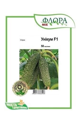 Огірок Унікум F1. Виробник Spark Seeds (США). Відмінний вибір для вирощування огірків у захищеному ґрунті. Гібрид призначений для першого та другого обороту. Для підготовки розсади насіння огірків Унікум F1 починає зсівати з лютого місяця до початку квітня. Для другого обороту насіння огірків Унікум F1 необхідно посіяти до другої половини липня. Перший збір збирають через 42 дні після пересадки розсади у підготовлений ґрунт. Рослина відрізняється пучковою зав'яззю, формує 3 - 4 зеленці в одному вузлі. Відстань між міжвузлями 5 – 7 см. Гібрид партенокарпічний, не скидає зав'язь, переносить різкі перепади температури. Середня вага товарних плодів 90 - 95 г. Огірки щільні, без порожнеч, підходять для свіжого ринку та засолювання. Високий відсоток товарних огірків, великі шпильки не деформуються при транспортуванні. Огірки Унікум F1 темно-зеленого кольору, дуже смачні та ароматні. Рослина стійка до борошнистої роси, кладоспоріозу, вірусу пожовтіння жилок огірка. Кущ відкритого типу забезпечує надходження сонячного світла.