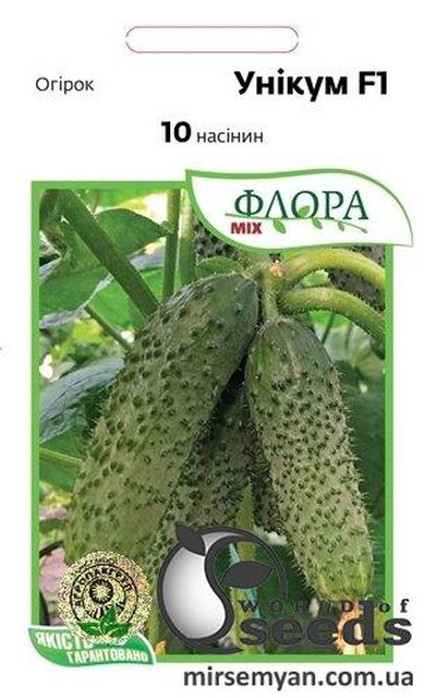 Огірок Унікум F1. Виробник Spark Seeds (США). Відмінний вибір для вирощування огірків у захищеному ґрунті. Гібрид призначений для першого та другого обороту. Для підготовки розсади насіння огірків Унікум F1 починає зсівати з лютого місяця до початку квітня. Для другого обороту насіння огірків Унікум F1 необхідно посіяти до другої половини липня. Перший збір збирають через 42 дні після пересадки розсади у підготовлений ґрунт. Рослина відрізняється пучковою зав'яззю, формує 3 - 4 зеленці в одному вузлі. Відстань між міжвузлями 5 – 7 см. Гібрид партенокарпічний, не скидає зав'язь, переносить різкі перепади температури. Середня вага товарних плодів 90 - 95 г. Огірки щільні, без порожнеч, підходять для свіжого ринку та засолювання. Високий відсоток товарних огірків, великі шпильки не деформуються при транспортуванні. Огірки Унікум F1 темно-зеленого кольору, дуже смачні та ароматні. Рослина стійка до борошнистої роси, кладоспоріозу, вірусу пожовтіння жилок огірка. Кущ відкритого типу забезпечує надходження сонячного світла.