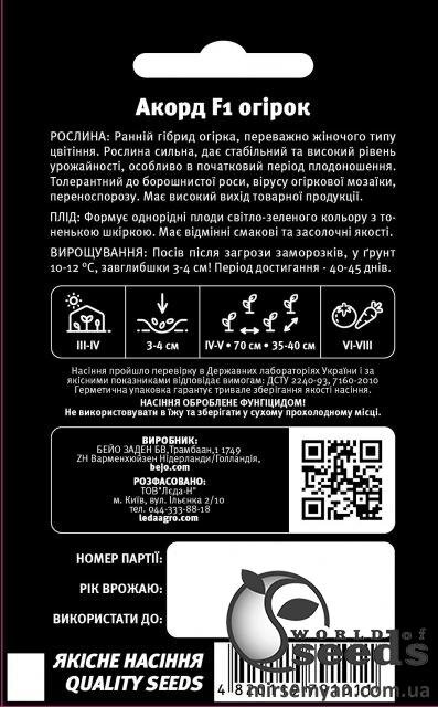 Упаковка МініТермін дозрівання Ультраранній РаннійВиробник Bejo ZadenОгірок Акорд F1 20 семена Л