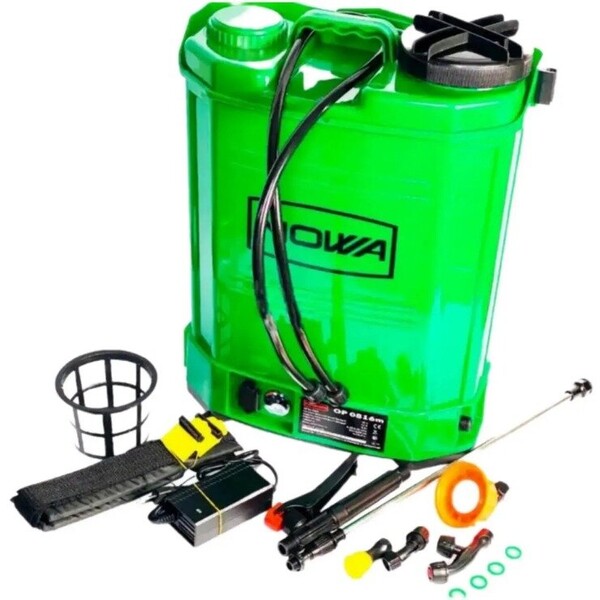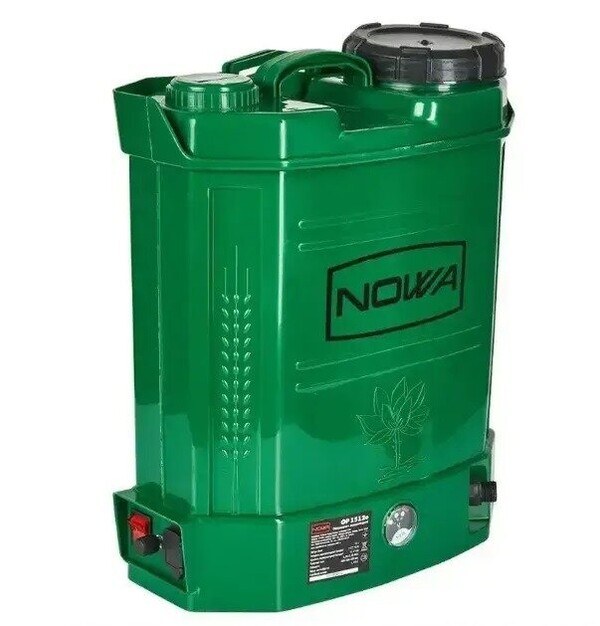 Обприскувач NOWA OP 1516m обладнаний 12 В акумулятором ємністю 15 А·год, що дає змогу працювати до 300 хв на одному заряді.