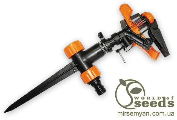 Зрошувач пульсуючий, пластиковий, на кілку, ECO LINE, ECO-TS1004 Регулювання кута повороту та нахилу струменя з фіксацією вибраного сектора. Можливе послідовне підключення з іншими зрошувачами. Область зрошення ∅27 м