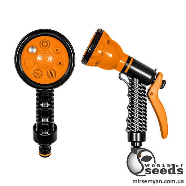 Пістолет 7-функціональний з адаптером під конектор, дозволяє виробляти полив різними струменями води. Регульована сила струменя.