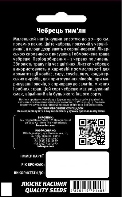 netherlands Упаковка МініВиробник Hem Zaden B.V. (Netherlands)Чебрець (Тім'ян) 0,3 г. L (Hem Zaden BV Netherlands)