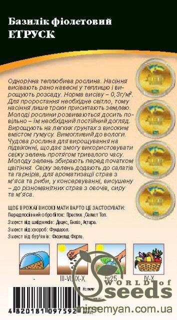 Базилік фіолетовий Етруск, Однорічна теплолюбна рослина. Насіння висівають рано навесні в теплицю та вирощують розсаду. Норма висіву – 0,3/м2. Вирощують на ґрунтах з високим вмістом гумусу. Вибагливий до вологи. Чудова рослина для вирощування на підвіконні. Молоду зелень збирають перед початком цвітіння.