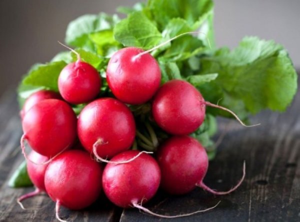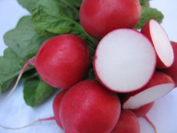 Рослина досить потужна. Листова розетка напівпрямостояча, у висоту досягає 12-15 см. Листя овальне, розширене догори. У здорової редиски листя темно-зеленого кольору та з легким глянцевим блиском. Черешок у листя довгий, бурого або коричневого відтінку.