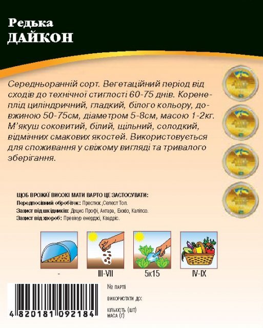 Редька дайкон – це середньоранній сорт. Вегетаційний період від сходів до технічної стиглості 60-75 днів. Коренеплід циліндричний, гладкий, білого кольору, довжиною 50-75 см, діаметром 5-8 см, масою 1-2 кг. М'якуш соковитий, білий, щільний, солодкий, відмінних смакових якостей. Використовується для споживання у свіжому вигляді та тривалого зберігання. Дайкон обробляють у відкритому та захищеному грунті. У відкритому ґрунті перед посівом восени або напровесні вносять перегній або компост (1 кг на 1 м²) і мінеральні добрива: сульфат амонію та сірчанокислий калій – 20 грам на 1 м², суперфосфат – 40 грам на 1 м².