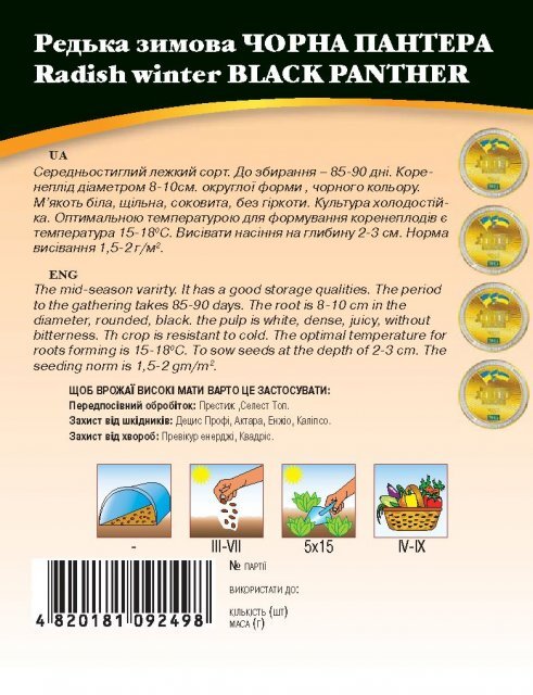 Редька зимова Чорна Пантера Середньостиглий лежачий сорт. До прибирання – 85-90 дні. Коренеплід діаметром 8-10см. округлої форми, чорного кольору. М'якуш білий, щільний, соковитий, без гіркоти. Культура холодостійка. Оптимальною температурою для формування коренеплодів є температура 15-18°С. Висівати насіння на глибину 2-3 см. Норма висіву 1,5-2 г/м².