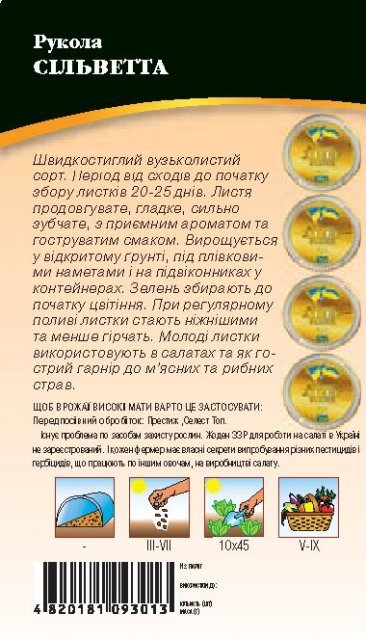 World of Seeds ukraine Упаковка МініТермін дозрівання РаннійКолір ЗеленийВиробник World of SeedsНасіння рукола Сільветта 0,5г. WoS