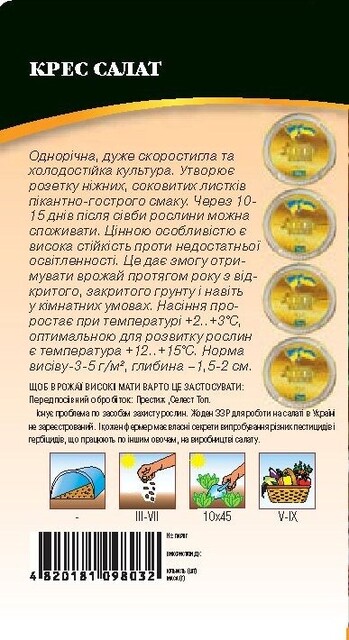 Однорічна, дуже скоростигла і холодостійка культура. Утворює розетку ніжного, соковитого листя пікантно-гострий смак. Через 10-15 днів після посіву рослини можна вживати в їжу. Цінною особливістю є висока стійкість до недостатнього освітлення. Це дозволяє отримувати врожай протягом року з відкритого, закритого ґрунту і навіть у кімнатних умовах. Насіння проростає при температурі +2..+3°C, оптимальною для розвитку рослин є температура +12..+15°C. Норма висіву-3-5 г/м², глибина -1,5-2 см.