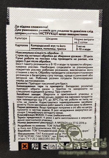 Застосування: обробку починають проводити, коли чисельність шкідників перевищує економічний поріг шкідливості. Препарат рівномірно наносять на листову поверхню рослини. Об'єм робочого розчину має бути достатнім для повного покриття всієї листової поверхні культури. Не можна проводити обприскування в період цвітіння, є токсичним для бджіл.